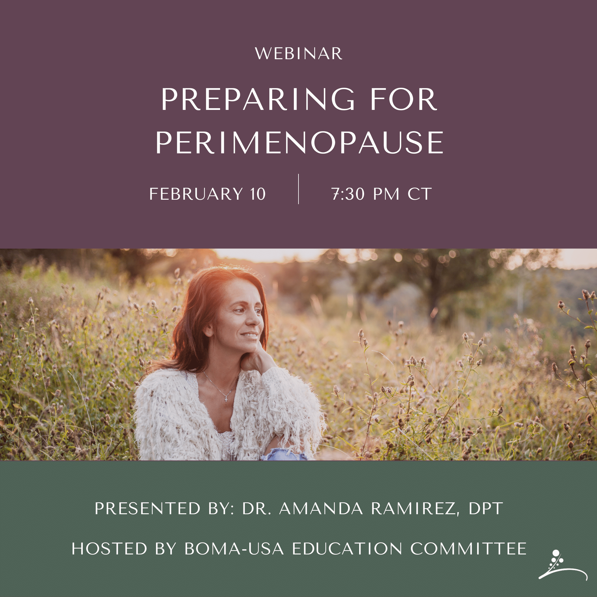 Hosted by BOMA-USA, this webinar features Dr. Amanda Ramirez, DPT, Certified Billings Teacher, who will guide attendees through the physical and hormonal changes that often arise during perimenopause — with a particular focus on strength, pelvic floor health, and fertility awareness in midlife.
